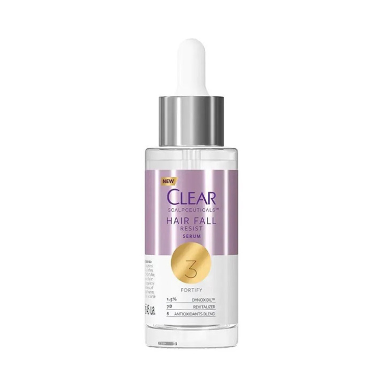 เคลียร์ สกาล์ปซูติคอลส์ เซรั่ม แฮร์ฟอล รีซิสท์ ผลิตภัณฑ์ปกป้องผมขาดหลุดร่วง อีกขั้นของการบำรุงผมที่เหนือกว่าด้วยขั้นตอนการบำรุง 3 ขั้นตอน เสมือนกับขั้นตอนการดูแลผิว ด้วยส่วมผสมที่ทรงประสิทธิภาพในการจัดการกับปัญหาผมขาดหลุดร่วงอย่าง ไดน็อกซิดิล ที่พัฒนากระบวนการสกัดด้วยเทคนิคไฮโดรไลซิสและผ่านการสกัดบริสุทธิ์ถึง 3 ขั้นตอน ด้วยสูตรที่ผ่านการทดสอบทางคลินิกแล้วว่าช่วยเพิ่มการยึดเกาะของผม และเสริมให้ผมที่ขึ้นใหม่แข็งแรง