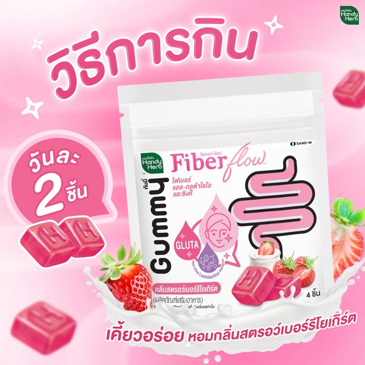 HANDY HERB/แฮนดี้เฮิร์บ ไฟเบอร์ โฟลว์ กัมมี่ กลิ่นสตรอว์เบอร์รีโยเกิร์ต 4 ชิ้น
