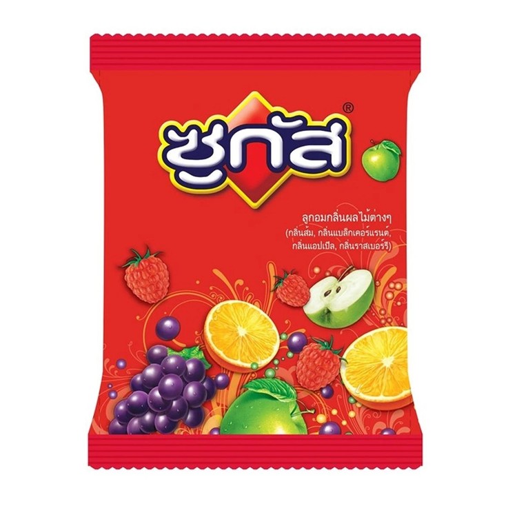 ลูกอมซูกัส ลูกอมรสผลไม้รวมที่มีต้นกำเนิดมาจาก สวิตเซอร์แลนด์ มีลักษณะเฉพาะตัวคือรูปสี่เหลี่ยมจัตุรัส ใช้อมและเคี้ยวเล่นเพลินๆ เคี้ยวหนึบหนับ ให้รสชาติ หวาน เปรี้ยว ของผลไม้เคี้ยวได้เต็มๆคำ