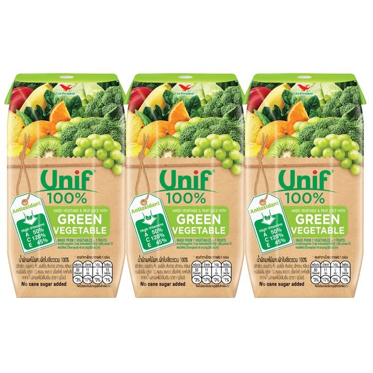Unif/ยูนิฟ น้ำผักผลไม้ผสมผักใบเขียวรวม 100% 200 มล. แพ็ค 3