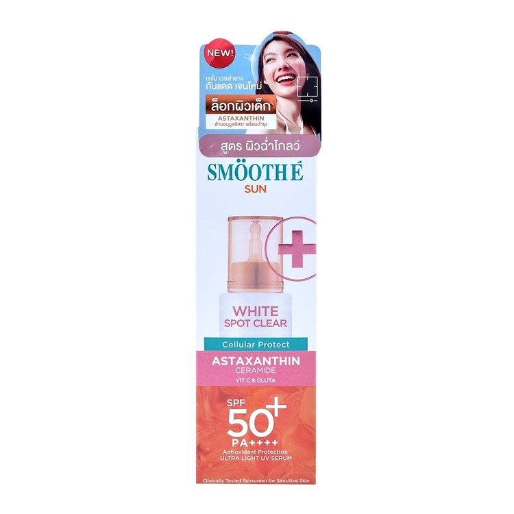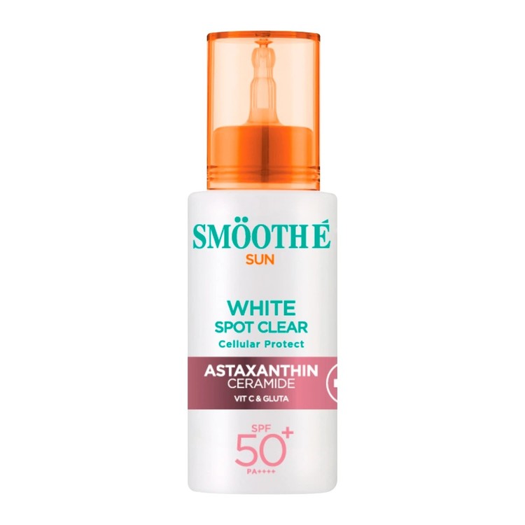 สมูทอี Sun White spot clear : Astaxanthin & ceramide Vit C & Glutathione (สูตรสีแดง : กันแดด + ผิวใส) HYBRID SUN SCREEN PROTECT YOUR CELL FOR BABY SKIN คุณสมบัติโดยรวม 4 Protection Beyond มี 5 เกราะป้องกันผิว