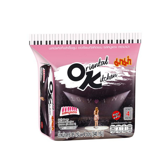 บะหมี่แห้งกึ่งสำเร็จรูป ออเรียนทัลคิตเชน รสหมูแดง ตรามาม่า เส้นกลม เหนียวนุ่ม ที่เข้ากับน้ำซอสหมูแดงที่มีความอร่อย กลมกล่อม เผ็ดร้อน หอมกลิ่นซอสหมูแดงเข้มข้น