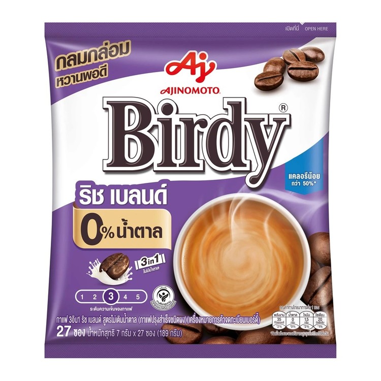 Birdy/เบอร์ดี้ 3อิน1 ริชเบลนด์ กาแฟปรุงสำเร็จชนิดผง สูตรไม่เติมน้ำตาล 7 ก. แพ็ค 27 ซอง
