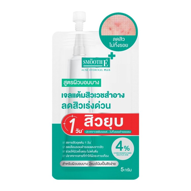 สมูทอี แอคเน่ ไฮโดรเจล พลัส เจลเวชสำอางเจลแต้มสิวสิวหายใน 1 วัน เจลแต้มสิว สำหรับผิวบอบบางแพ้ง่าย ปราศจากสเตียรอยด์ เวชสำอางสำหรับคนมีปัญหาสิว สิวยุบจริง ไม่ทิ้งรอยดำรอยแดง และหลุมสิว