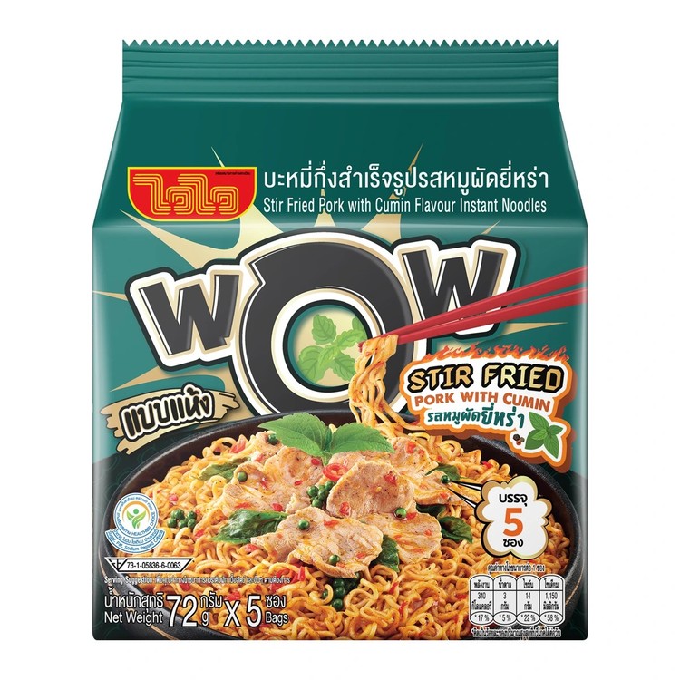 WAIWAI WOW/ไวไว ว้าว บะหมี่กึ่งสำเร็จรูปรสหมูผัดยี่หร่า 72 ก. แพ็ค 5
