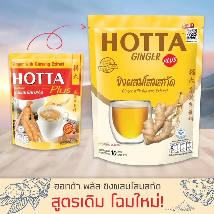 Hotta/ฮอทต้า พลัส ขิงผสมโสมสกัด สูตรน้ำตาลน้อยกว่า 10 ซอง