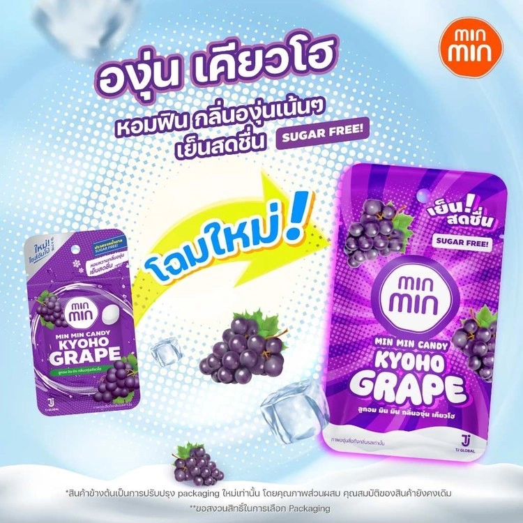 มิน มิน ลูกอม กลิ่นองุ่นเคียวโฮ ที่ปราศจากน้ำตาล หอมกลิ่นองุ่นเคียวโฮ เสมือนกับได้กินองุ่นเคียวโฮ พร้อมกับความเย็นสดชื่น ที่จะช่วยให้รู้สึกผ่อนคลาย