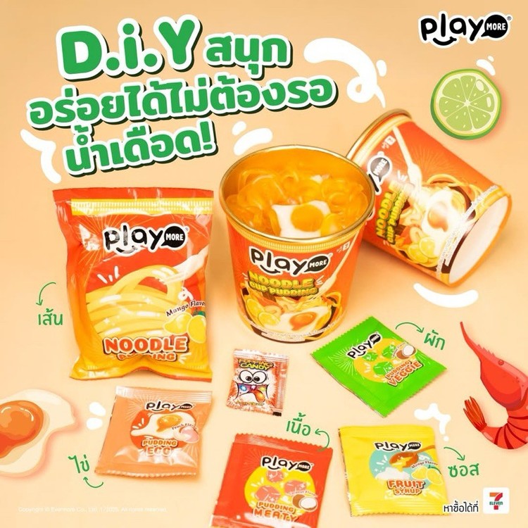 พุดดิ้งในธีมบะหมีกึ่งสำเร็จในน้ำซุปไซรัปรสผลไม้ มาพร้อมซอสแยมสตรอเบอร์รี่ เม็ด Popping ไข่ต้มจิ๋ว และวุ้นมะพร้าวเหมือนเครื่องปรุงบะหมี่กึ่งสำเร็จรูปแสนอร่อย ฉีกซองเทลงในถ้วย อร่อยและสนุกกันได้เลย