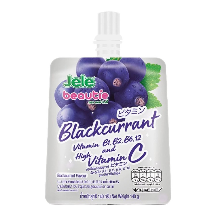 เจเล่บิวตี้ เยลลี่คาราจีแนน ผสมวิตามิน รสแบล็คเคอร์แรนท์ เยลลี่พร้อมดื่มผสมน้ำผลไม้ ได้รสชาติของผลไม้และแบล็กเคอร์แรนท์ซึ่งเป็นผลไม้ในตระกูลเบอร์รี่ ที่จะช่วยเพิ่มความหวานสดชื่น คลายหิว อิ่มอร่อย มีแคลลอรี่ต่ำ
