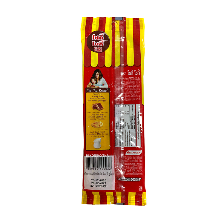โชกี้โชกี้ ช็อคโกแลตแท่ง ขนมรับประทานเล่น ที่จะพาคุณย้อนวันวานไปกับรสชาติช็อกโกแลตผสมถั่วลิสงที่มาในรูปแบบแท่งแสนอร่อย รสชาติหอมหวาน กรุบกรอบ ได้รสช็อกโกแลตแบบเต็มๆ คำ รสชาติที่เด็กๆ ชื่นชอบ
